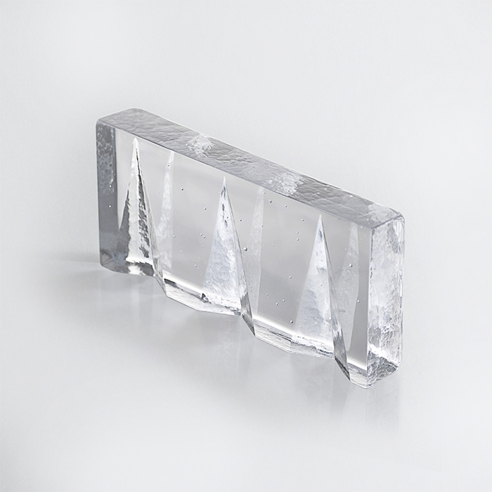 EG Block, by Mexican designer Emiliano Godoy, is inspired by an oceanic phenomenon. This shock wave generates a beautiful refraction in the glass and in the environment. The sharp geometric shapes create an organic movement in the viewer’s eye, while angular elements distort the concept of depth and height.